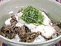 (6) 器にごはん・(5)・(4)・青じその順で盛り付ける。。 |